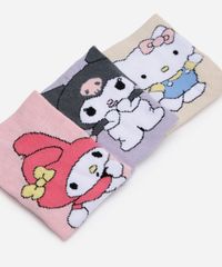 Kit com 3 meias confeccionadas em malha com algodão, proporcionando respirabilidade e elasticidade. As meias tem cano alto, com acabamento canelado garantindo um ajuste seguro e confortável sem apertar a perna, estampas divertidas da personagem Hello Kitty.