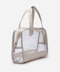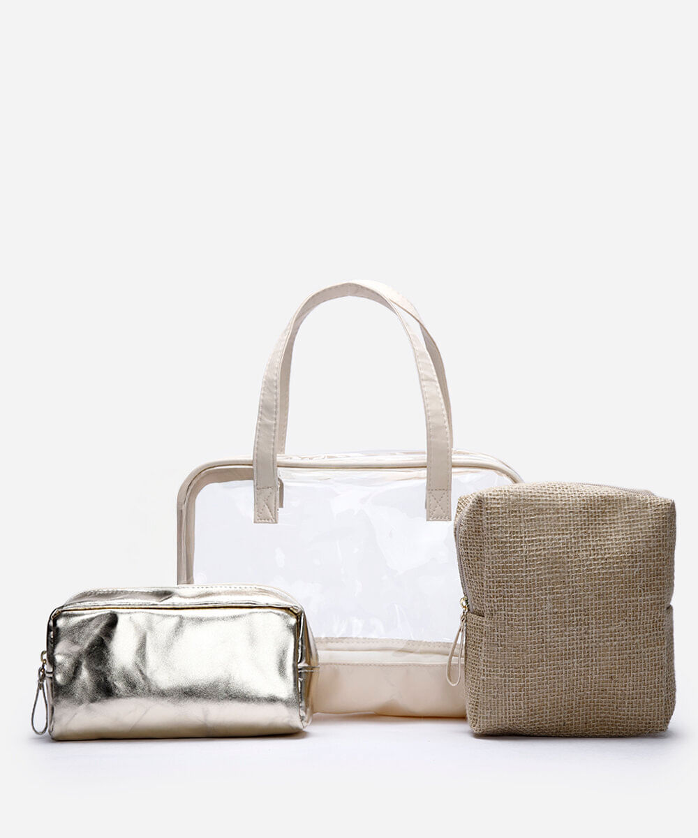 Kit de 3 nécessaires desenvolvidas em material sintético resistente. Composto por dois modelos pequenos, sendo um com textura de sisal e a outra com efeito metalizado. O terceiro modelo é grande com recorte em vinil transparente e alças duplas. Todas possuem fechamento por zíper.