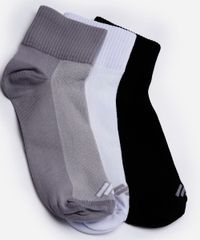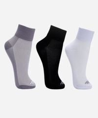 Kit de 3 pares de meias femininas desenvolvidas em malha de poliamida com elasticidade e toque macio. Os modelos esportivos possuem cano médio, tecido respirável que proporciona maior conforto durante as atividades, logo da marca em cor contrastante e acabamento canelado.