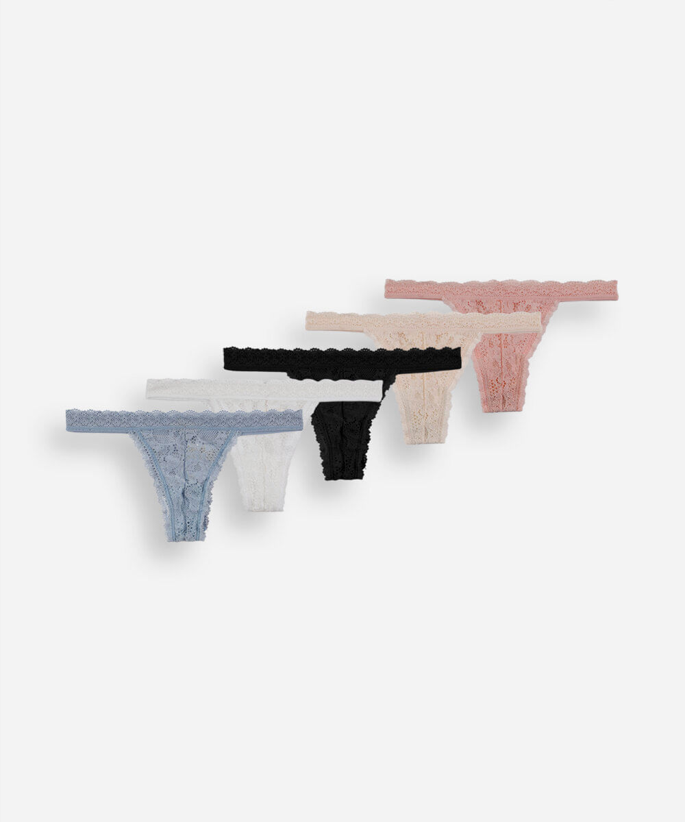 Kit de cinco calcinhas confeccionadas em renda com padronagem floral. Os modelos são fio dental, cós elástico, caimento ajustado, laterais finas modelo string, transparência e menor cobertura posterior. Possuem forro higiênico em malha de algodão. Composição: 90% poliamida, 10% elastano Modelo veste: P/38 Medidas da modelo: Altura: 1,80m Busto 79cm Cintura: 60cm Quadril: 89cm Instruções de lavagem: - Lavagem manual - Não alvejar - Não secar em secadora - Secar na vertical - Não passar - Não lavar à seco