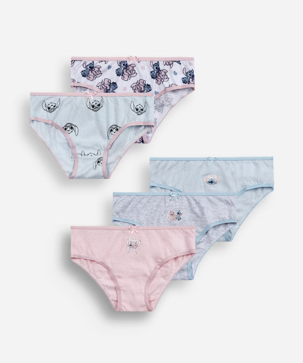 Kit de cinco calcinhas infantis confeccionadas em malha de algodão. O kit possui modelagem tanga, as peças tem elástico aplicado e laterais estreitas, estampa frontal da personagem "Angel" e acabamento pespontado. Composição: 100% algodão Instruções de lavagem: - Temperatura até 40º - Não alvejar - Não secar em secadora - Secar na vertical - Passar em temperatura média - lavar à seco