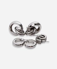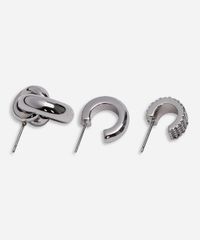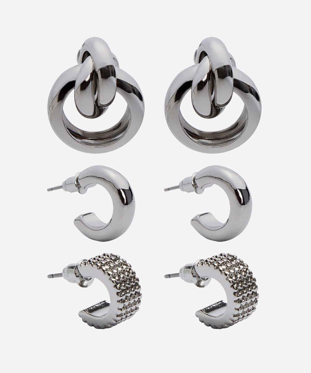 Kit de brincos desenvolvidos em metal e resina com banho prateado. Composto por três pares com modelos diferentes de argolas e fechamento prático por tarraxa, garantindo segurança e conforto durante o uso. Hipoalergênico e livre de níquel.