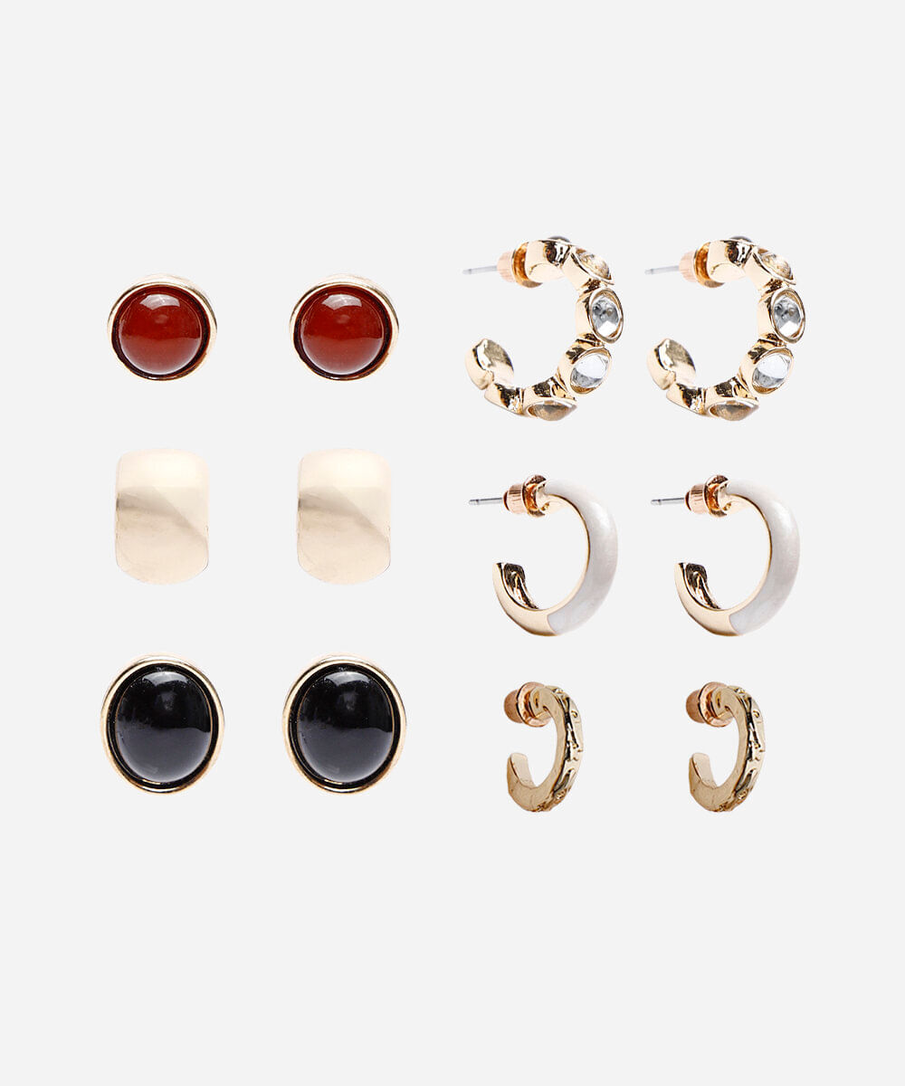 Kit de brincos desenvolvidos em metal e resina com banho dourado. Composto por seis pares com designs variados: três pares modelos argolas e três pares modelos botões, fechamento prático por tarraxa, garantindo segurança e conforto durante o uso. Hipoalergênico e livre de níquel.