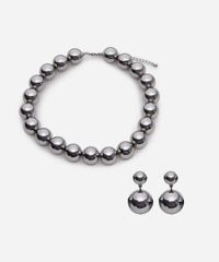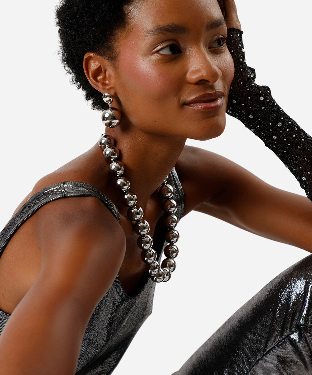 Kit de colar e par de brincos desenvolvidas em pérola artificiais com efeito metalizado. O colar tem fechamento por mosquetão e corrente com níveis de ajuste. O par de brincos possui fechamento por tarraxa. Este é um acessório hipoalérgico livre de níquel.