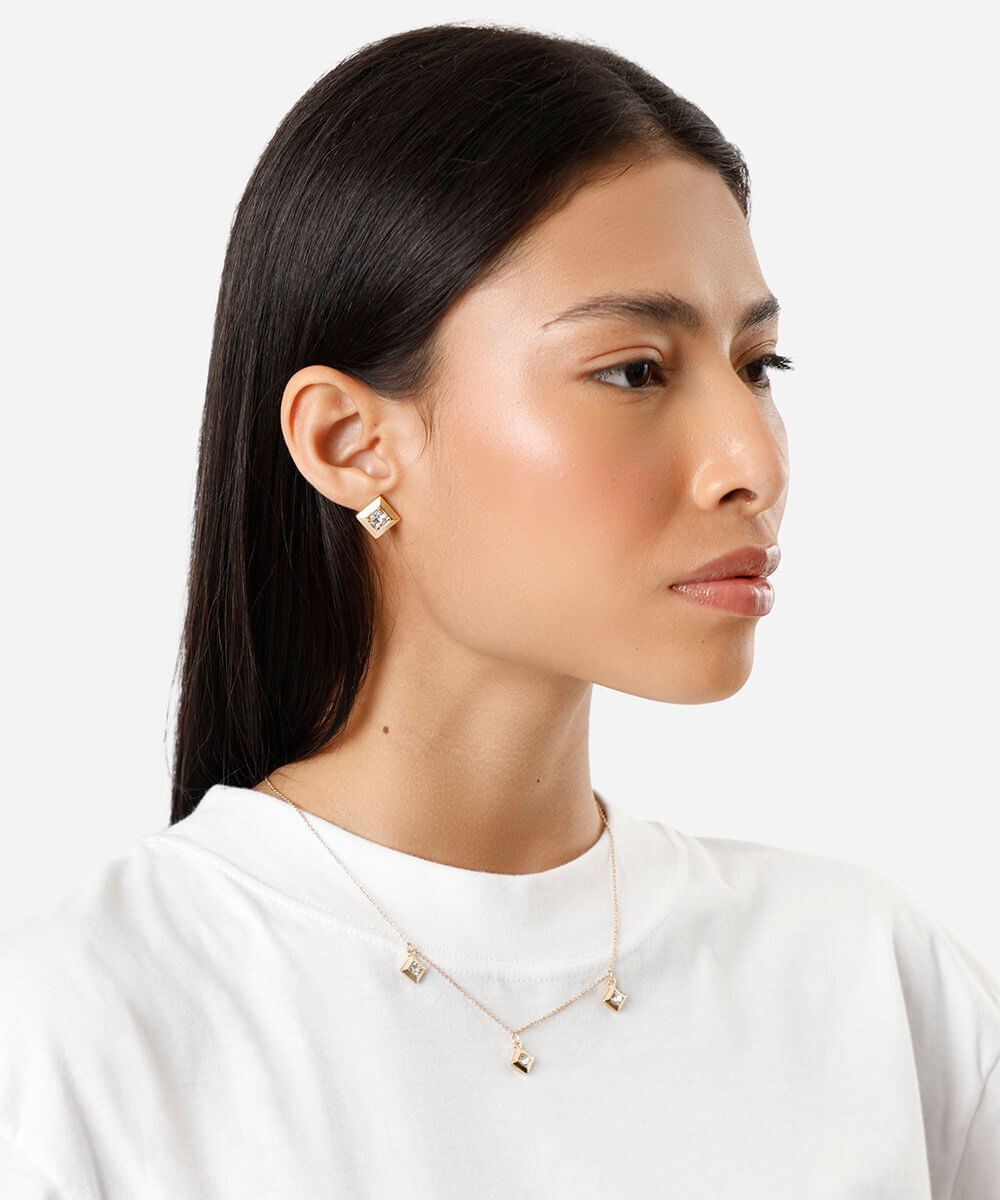 • Par de brincos de pino com design geométrico, harmonizando com o colar e adicionando um brilho discreto.