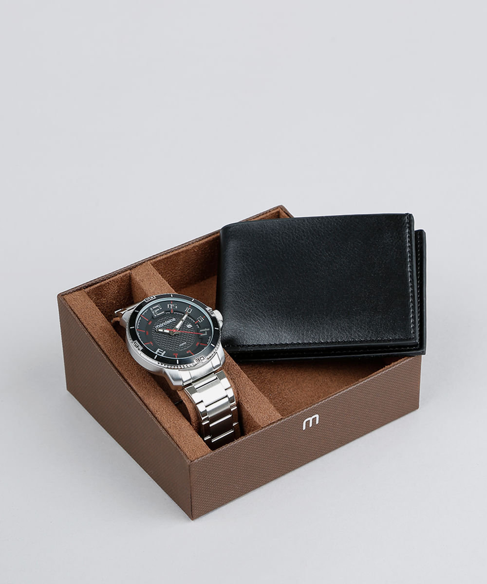 Relógio com pulseira feita em placas metálicas articuladas. A caixa de formato redondo foi desenvolvida em metal. O visor é analógico. A resistência é de 10 ATM, permitindo mergulho sem equipamento de oxigênio enquanto usa a peça. Acompanha carteira com compartimentos para cartão e dinheiro.