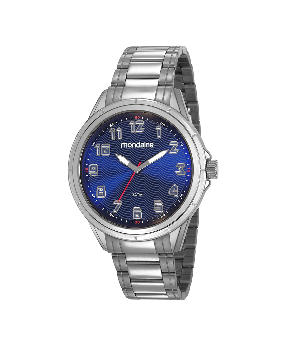 Relógio com pulseira feita em placas metálicas articuladas. A caixa de formato redondo foi desenvolvida em metal. O visor é analógico com fundo na cor azul. A resistência é de 3 ATM, permitindo contato superficial com água enquanto usa a peça. Acompanha uma carteira feita em material sintético, com três compartimentos para dinheiro e seis para cartões.