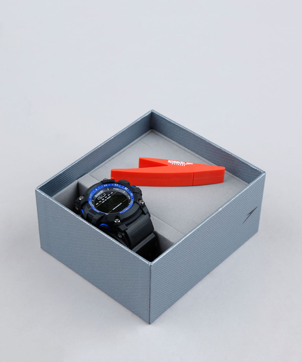 Relógio desenvolvido em borracha de silicone. O modelo tem caixa redonda e visor digital com calendário, cronômetro e luz. A resistência é de 5 ATM, permitindo nadar enquanto usa a peça. O fechamento é por fivela com níveis de ajuste. Acompanha pen drive com capacidade de 4GB.