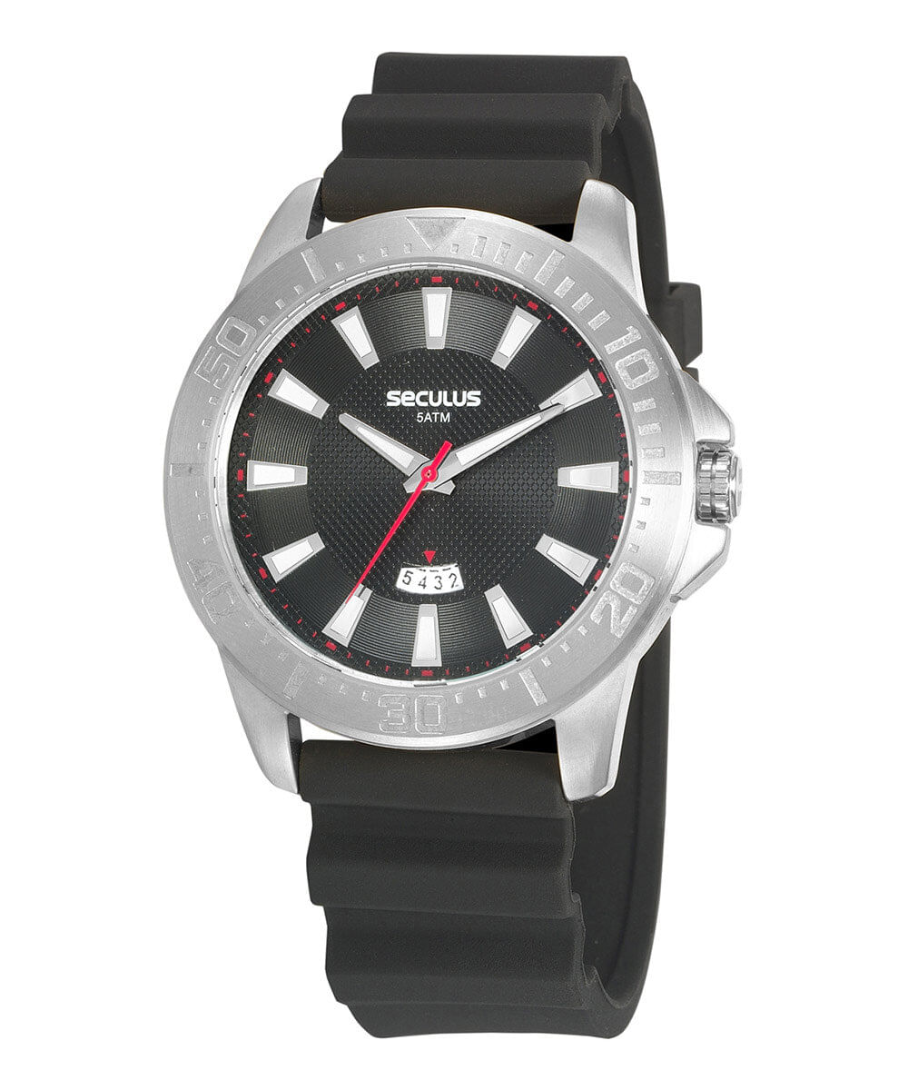 Relógio com pulseira feita em plástico. A caixa de formato redondo foi desenvolvida em metal. O visor é digital com fundo na cor preta. O modelo tem resistência de 5 ATM permitindo mergulho em baixa profundidade enquanto usa a peça. Acompanha pulseira.