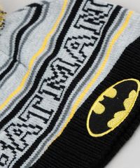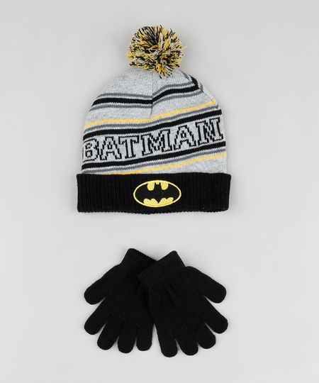 Kit de gorro infantil masculino confeccionado em tricô. As tramas formam estampa listrada com nome do personagem Batman, da Liga da Justiça. A barra é dobrada com patch do personagem. Acompanha um par de luvas.