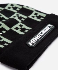 Kit infantil de gorro e par de luvas confeccionados em tricot com toque macio. As peças são texturizadas com acabamento canelado. O gorro possui estampa com desenho do personagem de Minecraft e tag com escrita, acabamento em cor contrastante. As luvas possuem modelo tradicional.