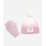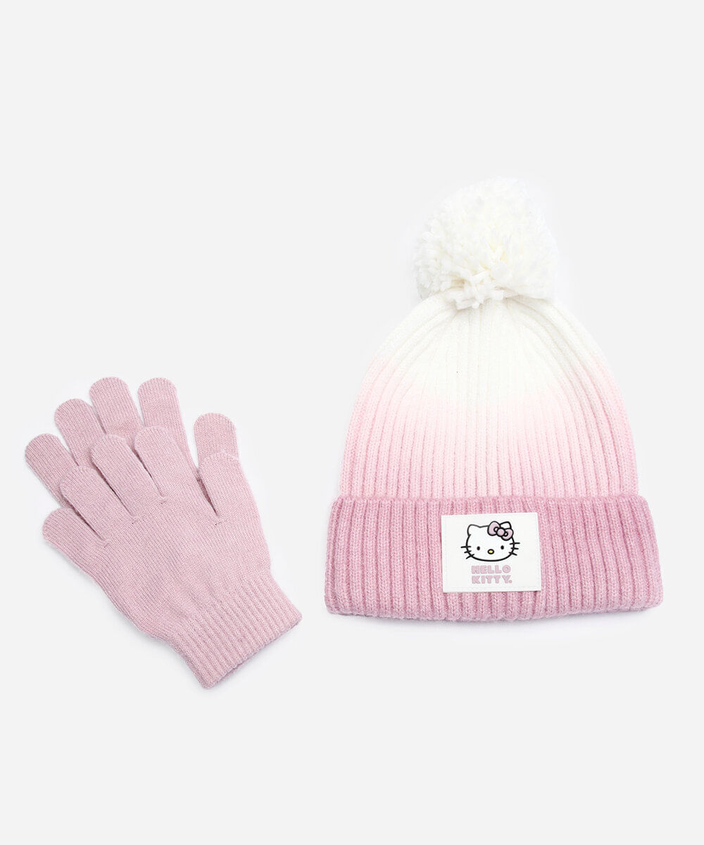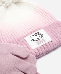 Kit gorro e luva infantil confeccionado em tricot com efeito ombré. O gorro possui acabamento canelado com dobra, detalhe de etiqueta aplicada emborrachada da personagem "Hello Kitty", pompom aplicado no topo e acabamento canelado. A luva com divisórias para os dedos, proporcionando melhor ajuste e mobilidade e acabamento canelado.