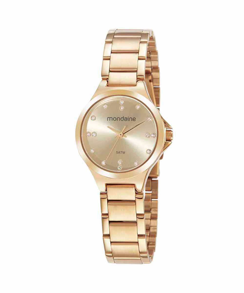 Relógio Mondaine com caixa desenvolvida em metal resistente e formato redondo com visor dourado. Mecanismo analógico, vidro de cristal mineral e pulseira de aço. Acompanha um colar e um par de brincos.
