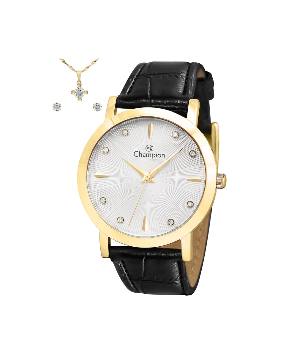 Kit de relógio feminino Champion analógico cn24226y dourado. Desenvolvido em couro com pulseira preta e visor prateado. Possui resistência à água 5atm e mecanismo analógico. Acompanha colar e par de brincos.