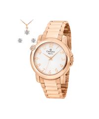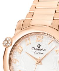 Kit de relógio feminino Champion analógico cn26626e rosê. Desenvolvido em aço com pulseira rose e visor branco. Possui resistência à água 5atm e mecanismo analógico. Acompanha colar e par de brincos.