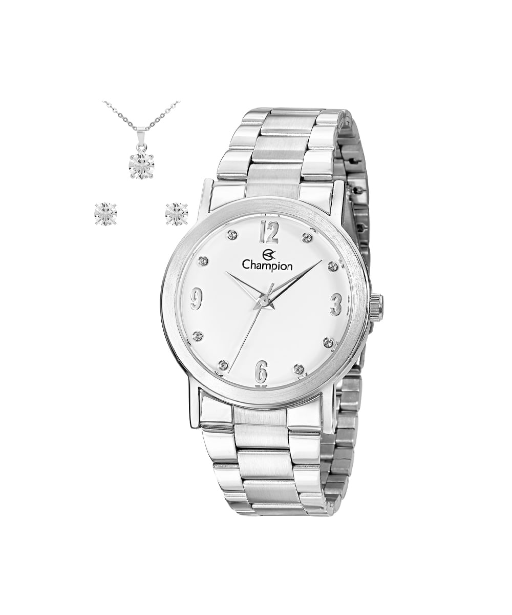 Kit de relógio feminino Champion analógico cn29025d prateado. Desenvolvido em aço com pulseira prateada e visor prateado. Possui resistência à água 5atm e mecanismo analógico. Acompanha colar e par de brincos.