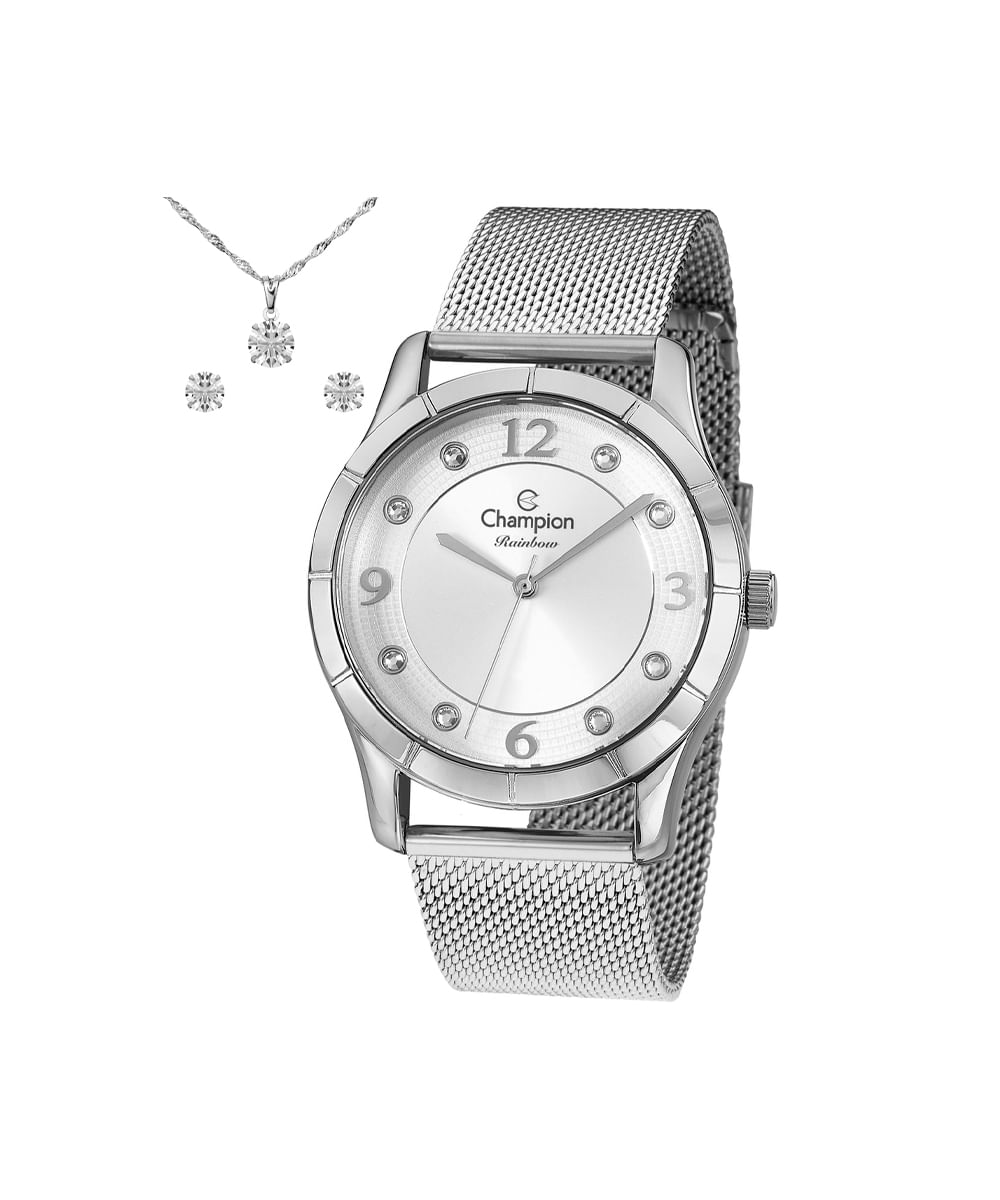 Kit de relógio feminino Champion analógico cn29910y prateado. Desenvolvido em aço com pulseira prateada e visor prateado. Possui resistência à água 5atm e mecanismo analógico.