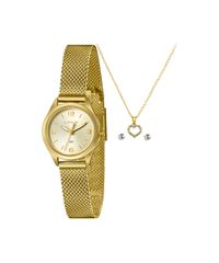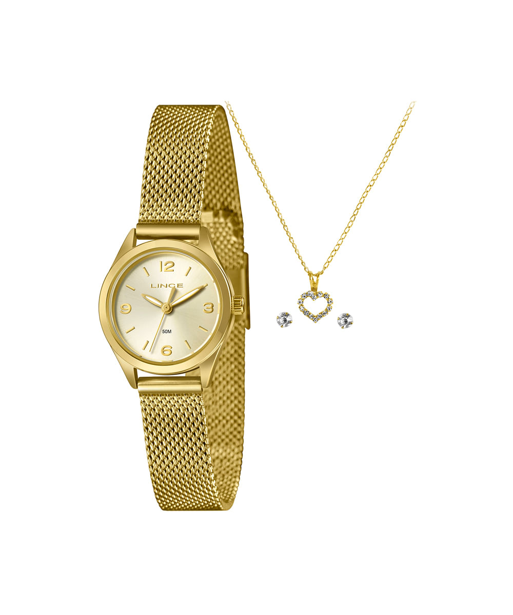 Kit de relógio feminino Lince analógico lrgh271l25 kacgc2kx dourado. Desenvolvido em aço com pulseira e visor dourado. Possui resistência à água de 5atm e mecanismo analógico. Acompanha colar e par de brincos.