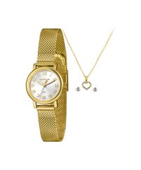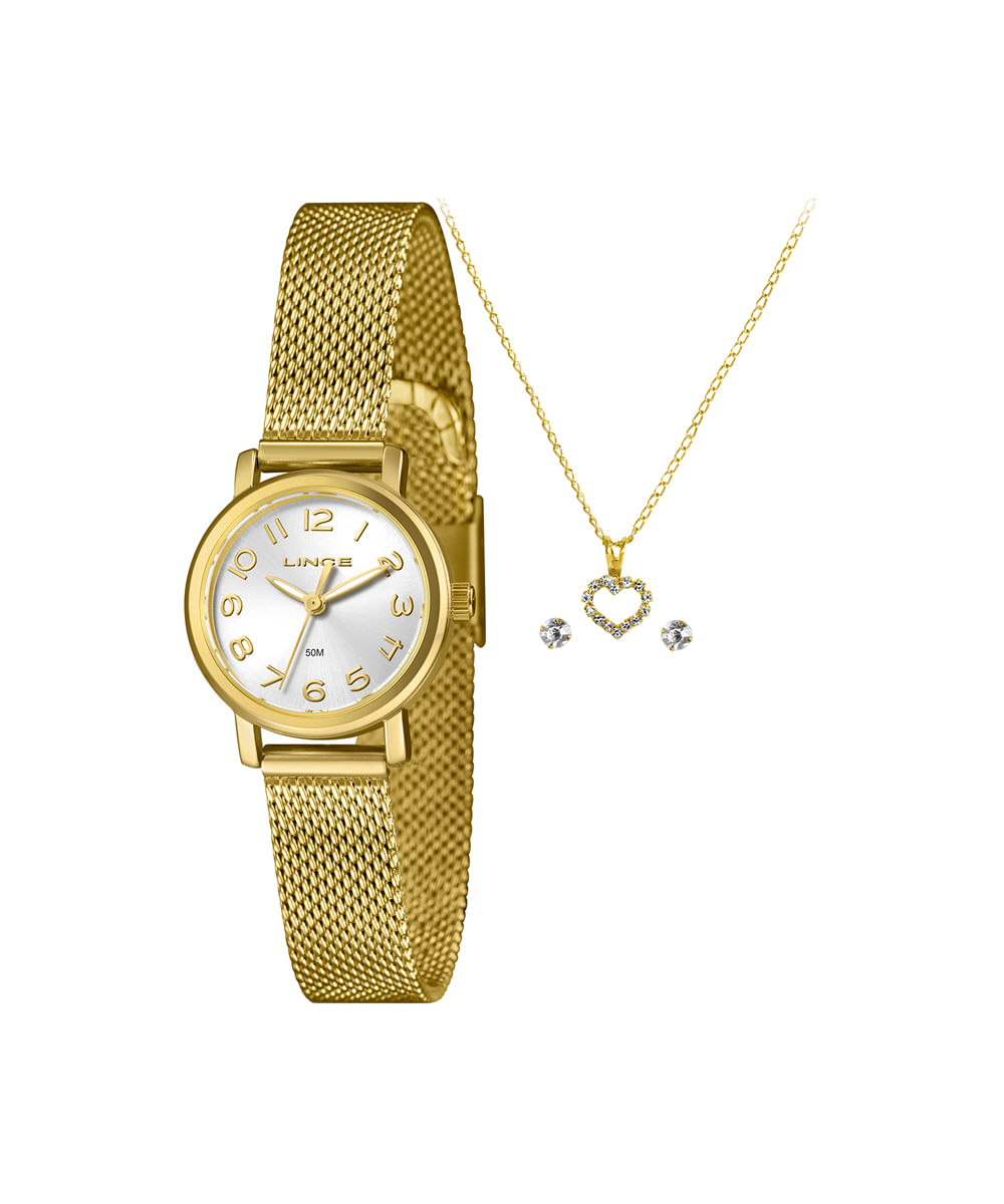 Kit de relógio feminino Lince analógico lrgh272l25 kacjs2kx dourado. Desenvolvido em aço com pulseira dourada e visor prateado. Possui resistência à água de 5atm e mecanismo analógico. Acompanha colar e par de brincos.