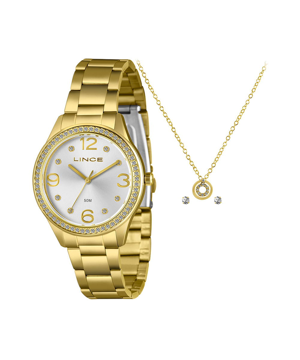 Kit relógio feminino lince analógico lrgj172l38kaahs2kx dourado. Desenvolvido em aço com pulseira dourada, visor prata e 37. Possui resistência à água de 5atm e mecanismo analógico. Acompanha colar e par de brincos.