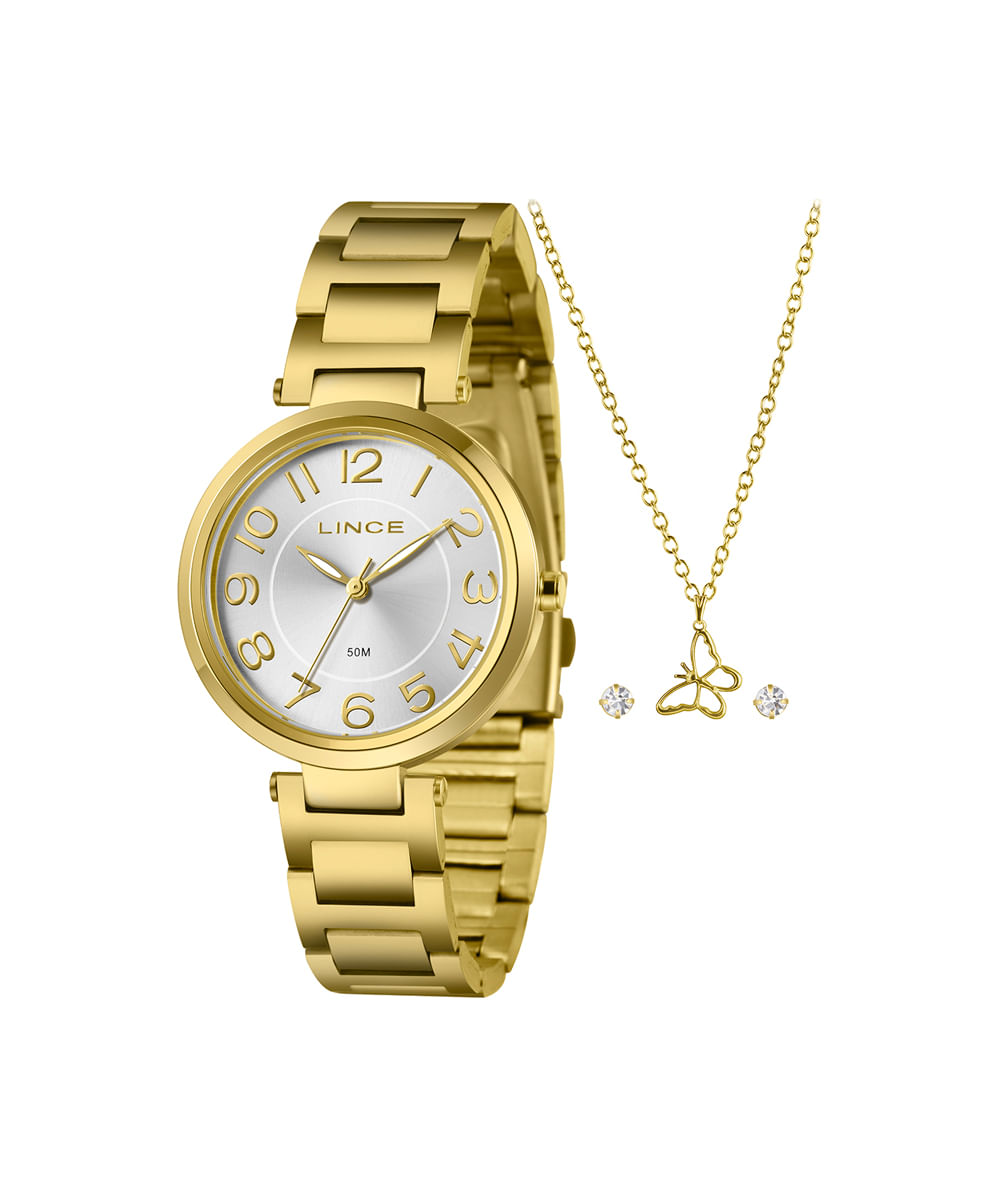 Kit de relógio feminino Lince analógico lrgm031l36 kbqvs2kx dourado. Desenvolvido em aço com pulseira dourada e visor prata. Possui resistência à agua de 5atm e mecanismo analógico. Acompanha colar e par e brincos.