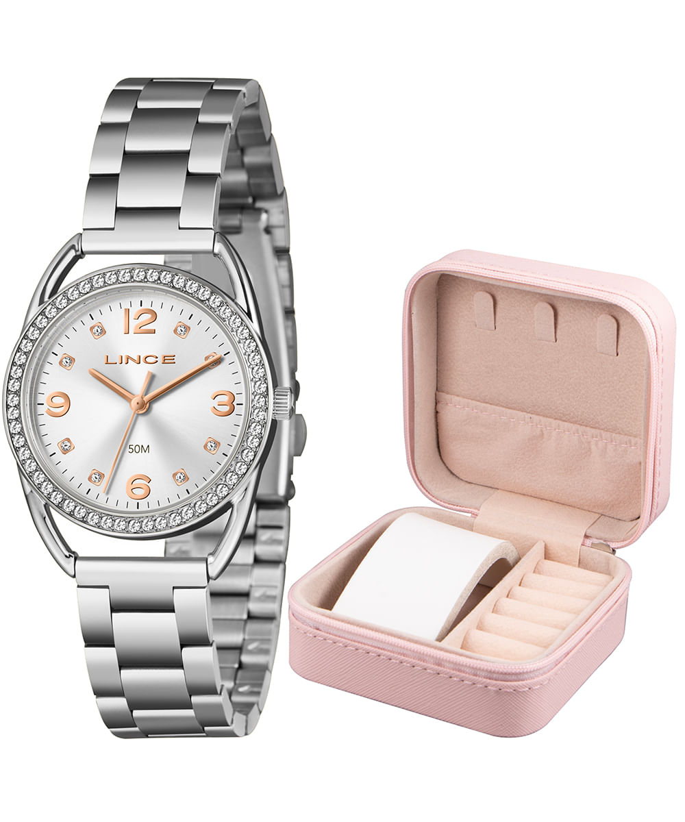 Kit de relógio feminino Lince analógico lrmh256l33 s2sx-pj prateado. Desenvolvido em aço com pulseira e visor prateado. Possui resistência à água de 5atm e analógico. Acompanha porta-joias.