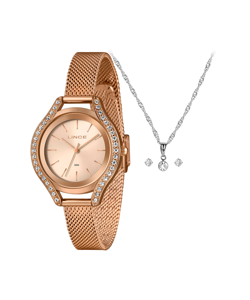 Kit de relógio feminino Lince analógico lrrm059l36 kad7r1rx rosê. Desenvolvido em aço com pulseira, visor e caixa rosê. Possui resistência à água de 5atm e analógico. Acompanha colar e par de brincos.