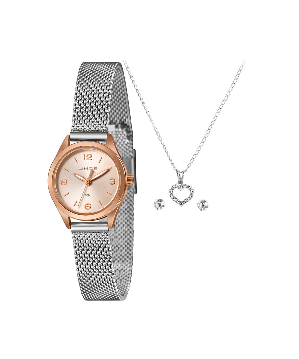 Kit de relógio feminino Lince analógico lrth271l25 kacir2sx prateado. Desenvolvido em aço com pulseira prateada e visor rose. Possui resistência à água de 5atm e mecanismo analógico. Acompanha colar e par de brincos.