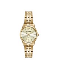 • Relógio com mecanismo analógico, caixa redonda de metal e pulseira em aço no tom dourado.