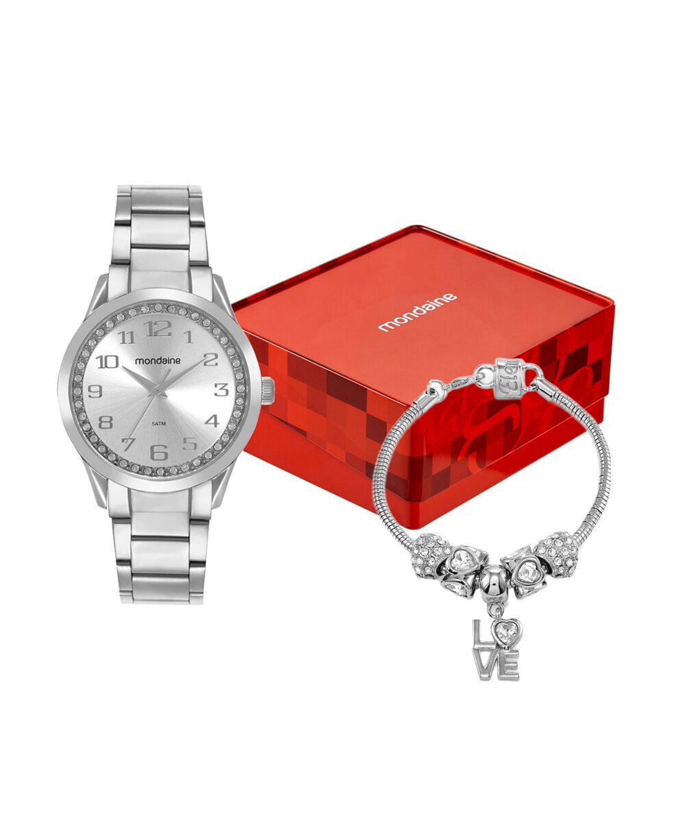 Kit de relógio feminino Mondaine analógico 99764l0mvne1kd prateado. Desenvolvido em aço com pulseira prateada, visor prateado e caixa metal. Possui resistência à água de 5atm e mecanismo analógico. Acompanha pulseira estilo berloque.