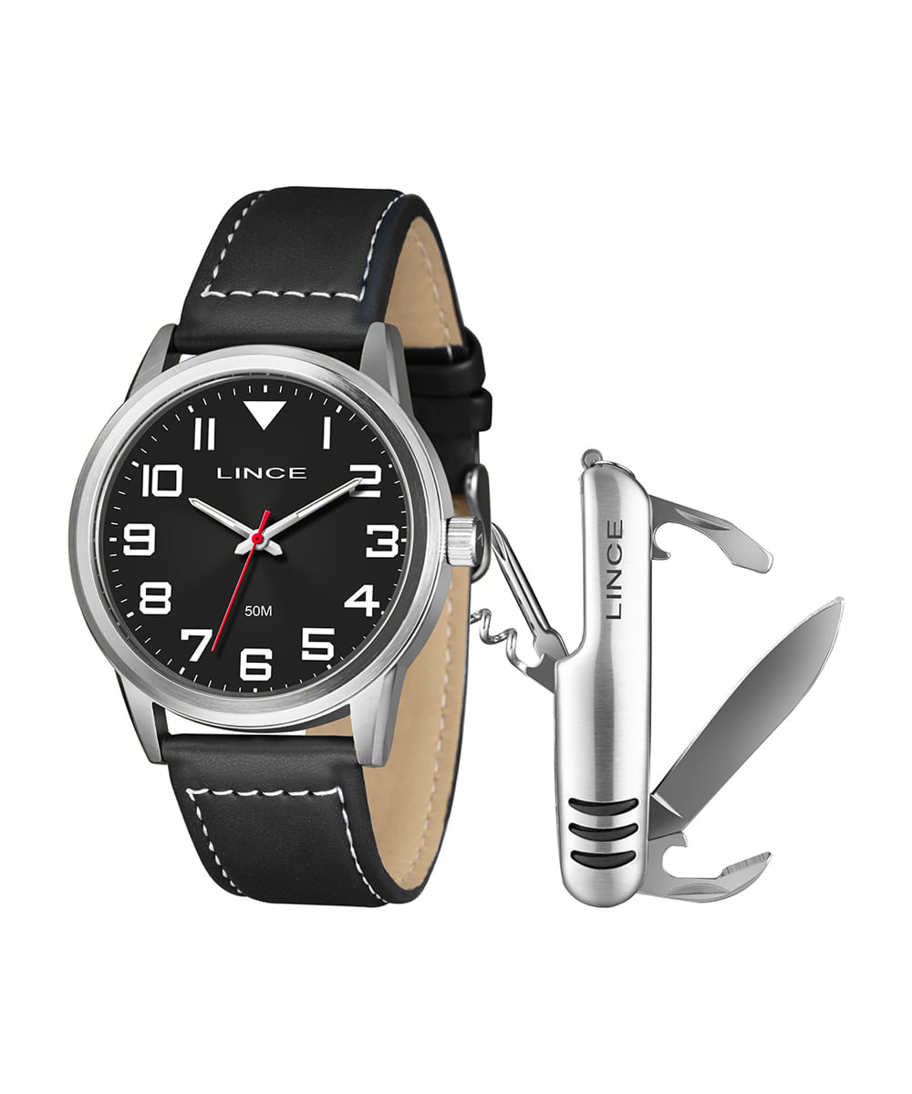Kit de relógio masculino Lince analógico mrch249l46 kaefp2pb prateado. Desenvolvido em couro com pulseira preta e visor preto. Possui resistência à agua de 5atm e mecanismo analógico. Acompanha canivete.