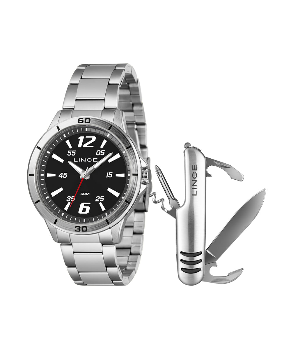 Kit de relógio masculino Lince analógico mrmm052l46 kbrqp2sx prateado. Desenvolvido em aço com pulseira prateada e visor preto. Possui resistência à agua de 5atm e mecanismo analógico. Acompanha canivete.