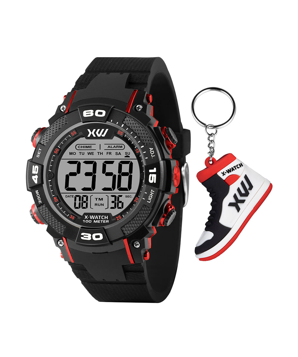 Kit de relógio masculino X-Watch digital xmppd795 k0bpbxpx preto. Desenvolvido em silicone com pulseira preta, visor digital positivo e caixa plástico. Possui resistência à água 10atm e mecanismo digital. Acompanha chaveiro.