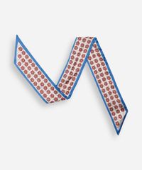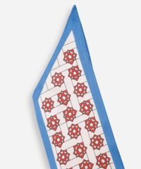 Lenço confeccionado em tecido plano com toque acetinado e estampado. O modelo tem formato retangular, com pontos assimétricas.
