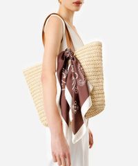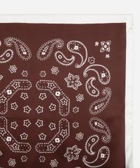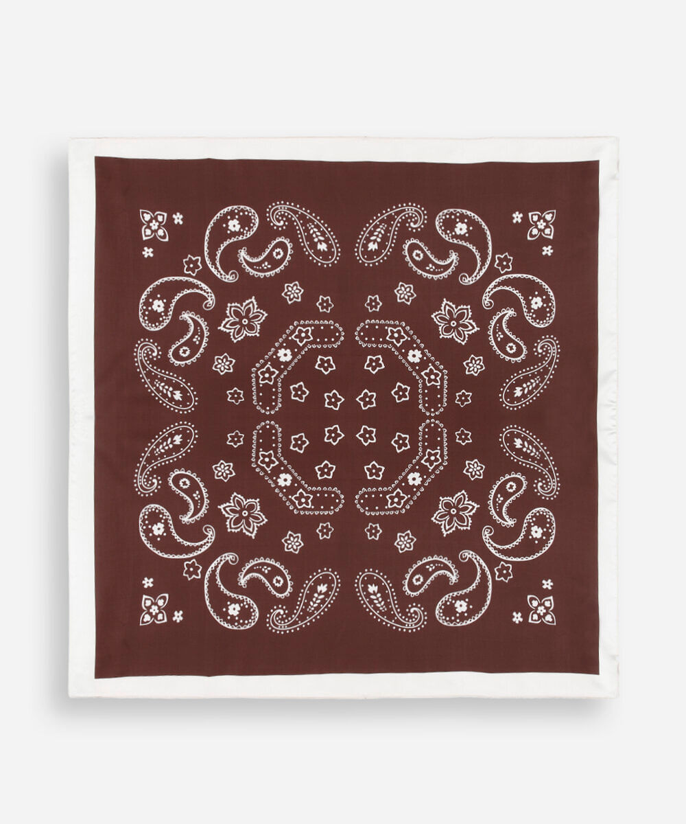 Lenço feminino confeccionado em tecido sintético com toque acetinado. Modelo tem formato quadrado, estampado com padronagem paisley e acabamento pespontado.