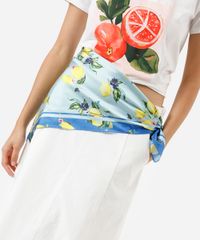 Lenço confeccionado em tecido plano com toque acetinado e estampa de limões siciliano. O modelo tem formato quadrado e acabamento pespontado em todo o contorno.