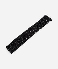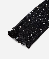 Luva feminina confeccionada em tule. Modelo alongado com shape ajustado, extremidades com acabamento em frufru e detalhes com strass aplicados.