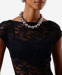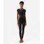Macacão feminino de carnaval confeccionado em renda com padronagem floral. A peça tem modelagem reta, com caimento acinturado e ajustado ao corpo. O modelo tem decote redondo, abertura posterior por botão e mangas curtas. Detalhe de acabamento com pesponto nas barras.