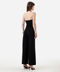 Macacão feminino confeccionado em malha. A peça tem modelagem acinturada e caimento reto e solto ao corpo. O modelo tem decote frente única e abertura posterior por botões. Detalhe de acabamento pespontado nas barras.