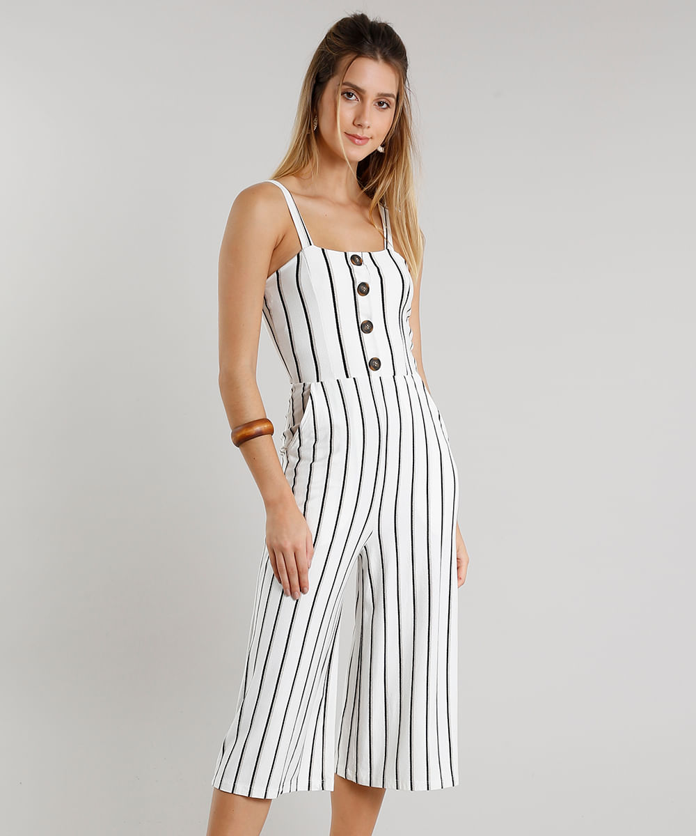Macacão feminino confeccionado em malha com elasticidade. O modelo se destaca pela estampa listrada em preto e kaki. Tem recorte com elástico embutido na cintura. O decote é redondo e as alças são médias. A parte frontal tem botões decorativos e dois bolsos. Tem forro em malha no busto.