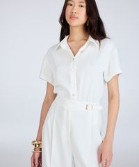 Macacão feminino confeccionado em tecido de alfaiataria com toque leve. A peça possui modelagem reta com caimento levemente solto, decote V com gola clássica, mangas curtas, fechamento frontal por botões e zíper, cintura alta com fivela no cós auxiliando no desenho da silhueta, detalhes de pregas e acabamento pespontado.