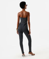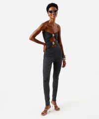 Macacão feminino de carnaval confeccionado em malha com fios de lurex que acrescentam brilhos. A peça tem modelagem reta, com caimento acinturado, ajustado ao corpo e recortes vazados na parte frontal. O modelo tem decote v com dois aviamentos decorativos na parte frontal e não possui alças. Detalhe de acabamento com pesponto nas barras.