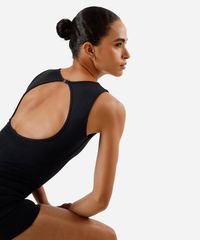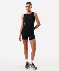 Macaquinho esportivo confeccionado em malha de poliamida. A peça tem modelagem ajustada ao corpo com recortes que modelam a silhueta. O modelo tem decote redondo, alças largas e fechamento por fivela de encaixe. Detalhe de acabamento pespontado nas barras.
