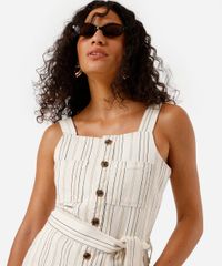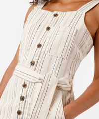 Macaquinho feminino confeccionado em sarja estruturada com estampa listrada. A peça tem modelagem acinturada e caimento reto e solto ao corpo. O modelo tem decote quadrado, fechamento por botões em vista e alças largas ajustáveis. Possui passantes e faixa para amarração, quatro bolsos frontais e dois posteriores. Detalhe de acabamento pespontado nas barras.
