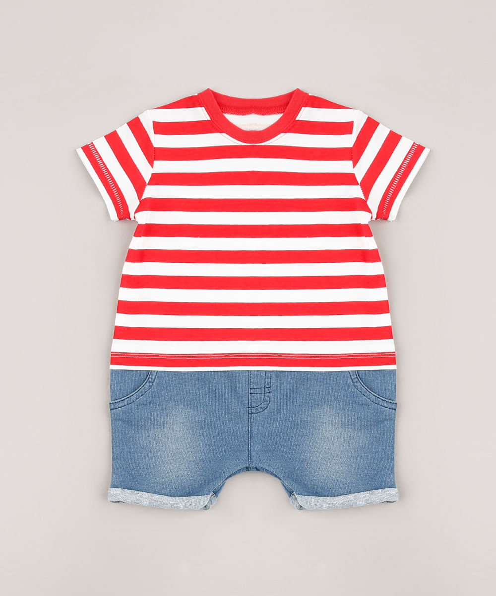 Macaquinho infantil masculino confeccionado em malha. O modelo se destaca pelo recorte que simula um conjunto de camiseta e bermuda. A parte de cima tem estampa listrada e a inferior é em tecido jeans. Tem dois bolsos decorativos na parte frontal. As mangas são curtas e o decote é redondo com botões de pressão. A barra tem acabamento dobrado.