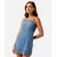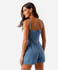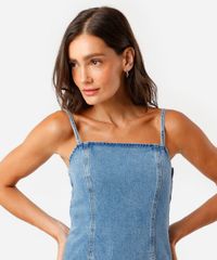 Macaquinho feminino confeccionado em jeans. A peça possui modelo short saia, decote quadrado, alças finas ajustáveis, detalhe de recortes, pequenas fendas frontais, acabamento pespontado e fechamento lateral por zíper.