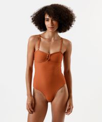 Maiô confeccionada em malha de poliamida com proteção UV e textura canelada. A peça tem caimento ajustado ao corpo. O modelo tem decote coração, fivela centralizada formando franzidos e alças finas ajustáveis e removíveis. Possui cobertura mediana posterior e forro.