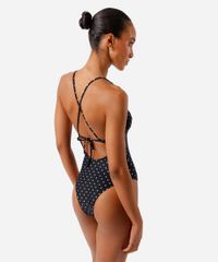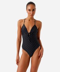 Economia de R$ 40,00Maiô confeccionado em malha de poliamida com proteção UV com padronagem de poá. A peça possui caimento ajustado ao corpo, frufru aplicado, decote profundo frontal e posterior com alças finas para amarração, bojo removível, forro e acabamento pespontado. Composição: 84% poliamida, 16% elastano Modelo veste: P/38 Medidas da modelo: Altura: 1,73m Busto: 86cm Cintura: 70cm Quadril: 101cm. Instruções de lavagem: - Lavagem manual - Não alvejar - Não secar em secadora - Secar na horizontal - Não passar - Não lavar à seco - Não limpar à úmido