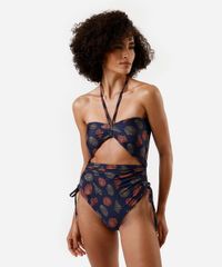 Maiô confeccionada em malha de poliamida com proteção UV e estampa de conchas. A peça tem caimento ajustado ao corpo, recorte vazado na parte frontal e posterior e tiras embutidas nas laterais que formam franzidos. O modelo tem decote frente única e alças finas para amarração. Possui cobertura mediana posterior e forro.