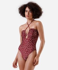Maiô feminino confeccionado em malha de poliamida com proteção UV e estampa poá. A peça tem modelagem ajustada ao corpo, decote halterneck, alças finas com ajuste por amarração, recorte vazado centralizado com franzidos e cobertura mediana posterior. Possui forro em malha.